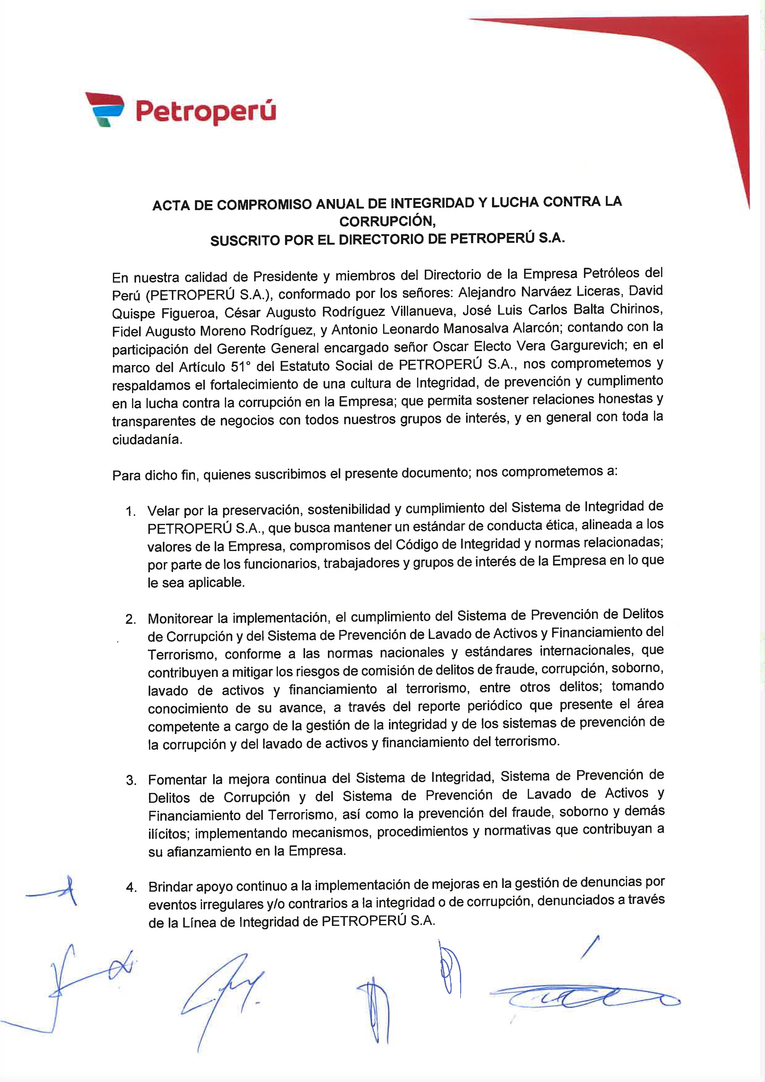 On december 12, 2023, the Board of Directors of Petroperú S.A., with the participation of the General Management, signed the Annual Commitment to Integrity and Fight Against Corruption Act through which they commit to supporting the strengthening of a culture of Integrity and fight against corruption in Petroperú S.A.; that allows us to maintain honest and transparent business relationships with all our interest groups, and in general with all citizens.