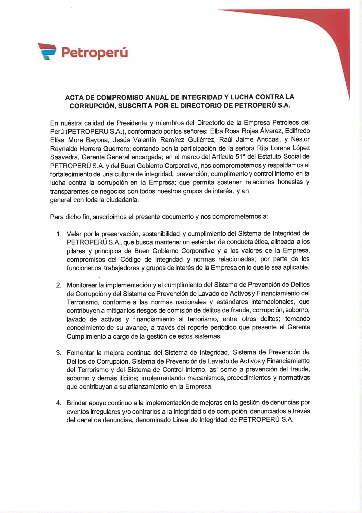 El 22 de enero de 2026, el Directorio de Petroperú S.A., con la participación de la Gerencia General suscribieron el Acta de Compromiso Anual de Integridad y Lucha Contra la Corrupción, por medio del cual se comprometen a respaldar el fortalecimiento de una cultura de Integridad y de lucha contra la corrupción en Petroperú S.A.; que permita sostener relaciones honestas y transparentes de negocios con todos nuestros grupos de interés, y en general con toda la ciudadanía.